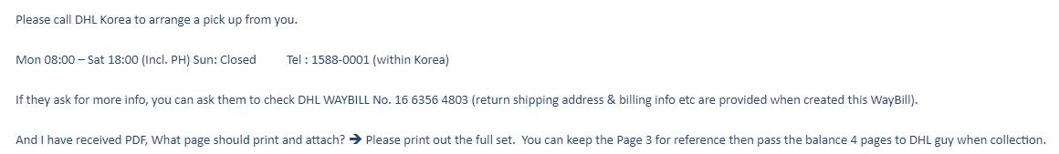 이 송장을 인쇄까지 하고 다 준비가 되었으면 DHL KOREA에 전화해서 픽업 요청을 해야 합니다.
