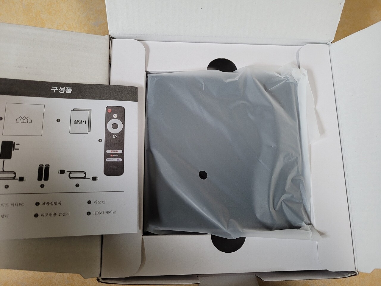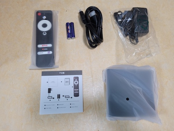 리모컨, 건전지, HDMI 케이블. 전원 케이블, 본체, 설명서가 구성품 끝입니다.