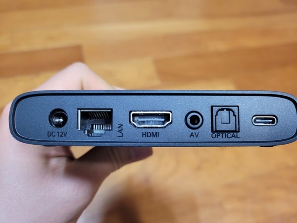 후면에 12V 전원 입력, LAN 연결, HDMI 단자. AV단자, 오디오 광 출력 단자, C타입포트(전원 입력으로만 사용 가능함!)가 있습니다.